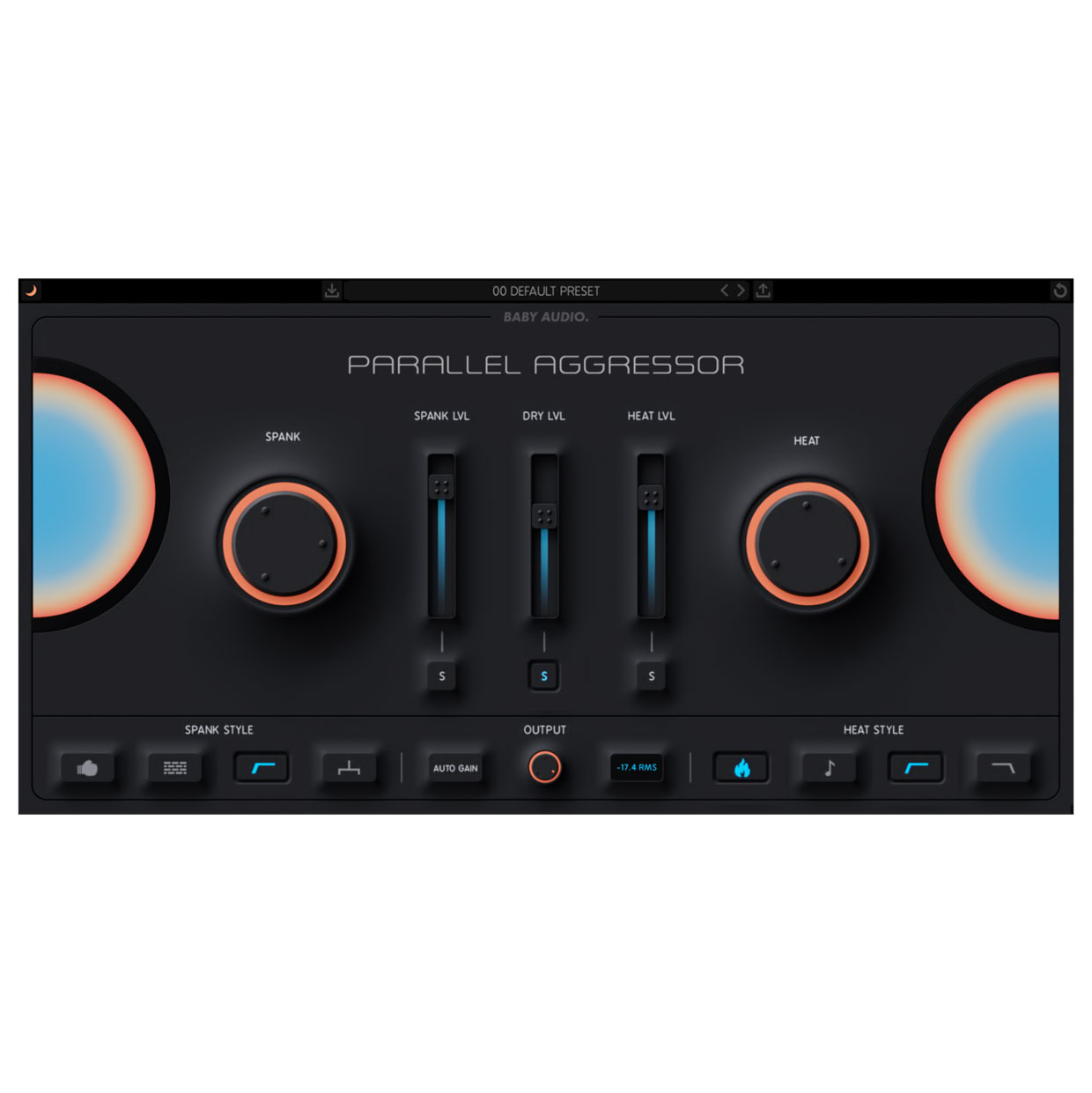 Parallel Aggressor lets you blend three parallel tracks: dry, saturated, and compressed, adding significant impact to your sound. The plugin’s “Spank” and “Heat” engines allow for aggressive compression and analog saturation, respectively, giving you full control over each effect. Fine-tune the mix balance of these signals to achieve dynamic depth and presence while retaining natural dynamics. Auto Gain ensures output levels stay consistent, even with different mix settings. It’s perfect for drums, bass, or any track that needs a punchy, full-bodied sound.
