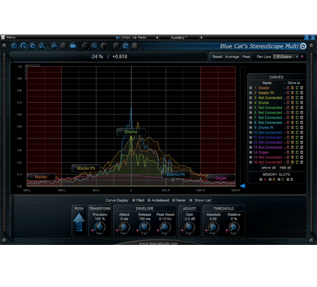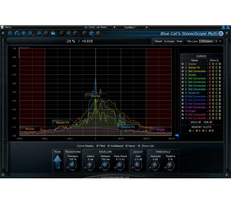 Blue Cat`s StereoScope Multi is a unique tool to compare the stereo image of several tracks in real time. It is the ideal solution for mixing: you can actually see which part of the stereo field every single instrument uses. It can also be used to analyze an effect chain see how audio effects influence the stereo image of your content.