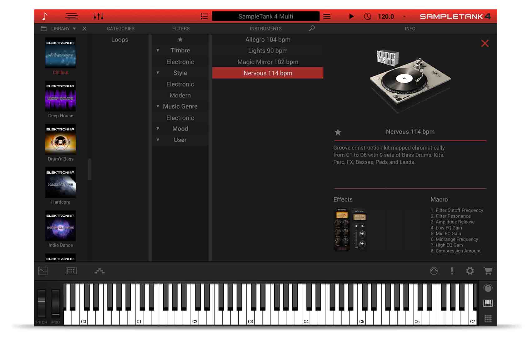 Ready to relax? Get cool with Chillout, a laidback library for SampleTank 3 that turns down the lights and turns up the atmosphere. You`ll enjoy retro melodies, sun-drenched beats and tape-saturated loops, all with that necessary touch of organic sweetness. This sound library gives you 4 kits and 252 loops pulled from 7 different categories like bass, percussion, pads, FX and more. With Chillout, you`ll have the ingredients for that perfect poolside sonic cocktail.