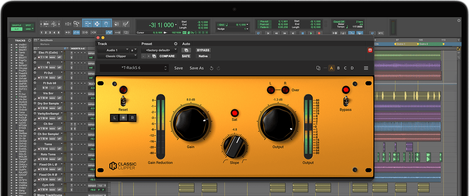 This processor uses peak clipping to tame unruly peaks, rather than the usual peak limiting, giving you another dynamics control option. Peak clipping is often a more transparent process than standard peak limiting, which is why mastering engineers often employ it. Despite its powerful engine, the Classic T-RackS Clipper is easy to use, with only: Gain, Slope, and Output controls. On top of acting as a last stage dynamic control, another clever use of this processor is to generate harmonic saturation: when set for high gain and lower output the track will get a range of saturation which, according to the levels set can go from some mild harmonics to a very pronounced distortion. This can be a very handy tool to breathe some more life and presence in a cold and sterile track, giving it boldness and personality, or to achieve some very special creative distortion effects, where a track processes with the T-RackS clipper will sound completely different.