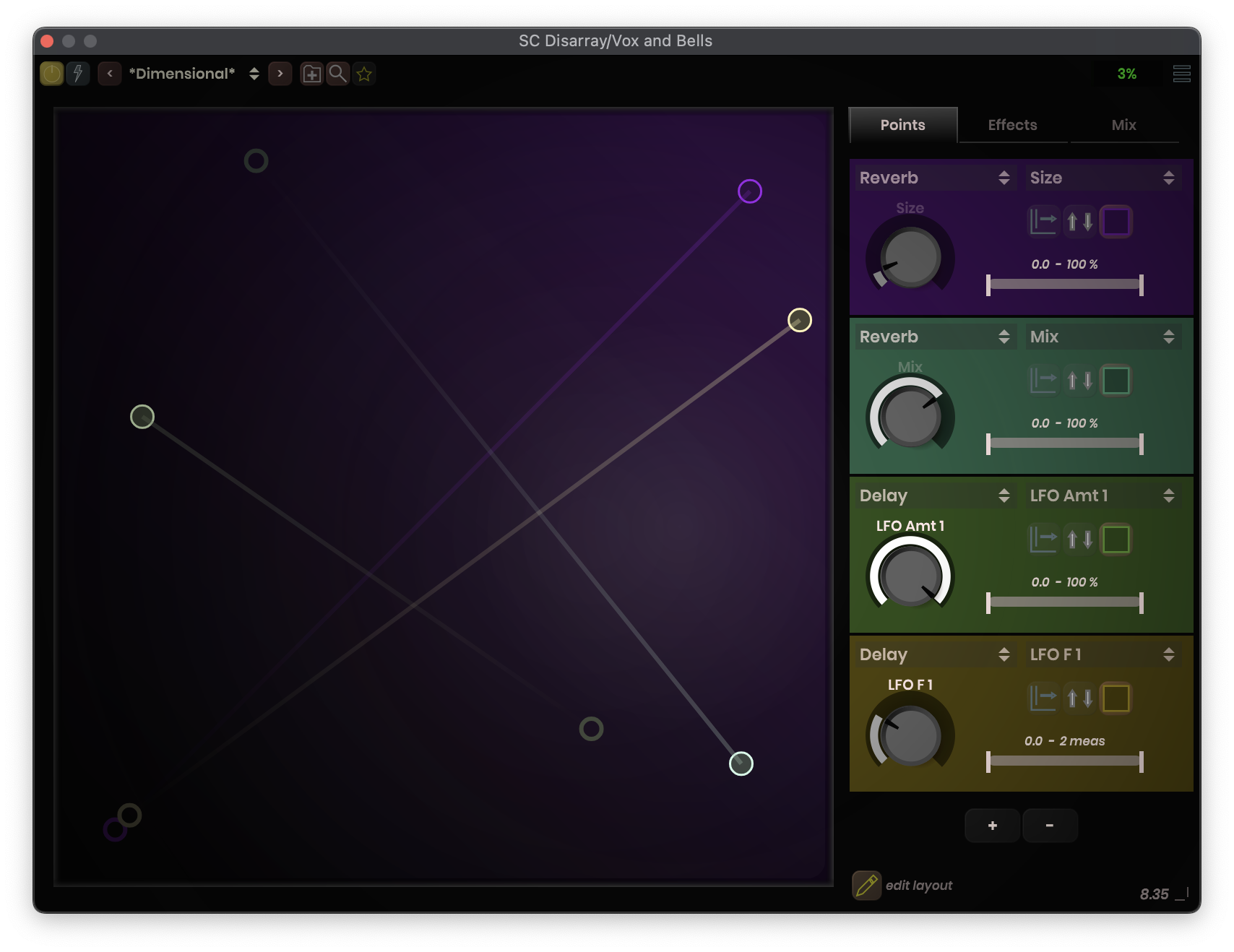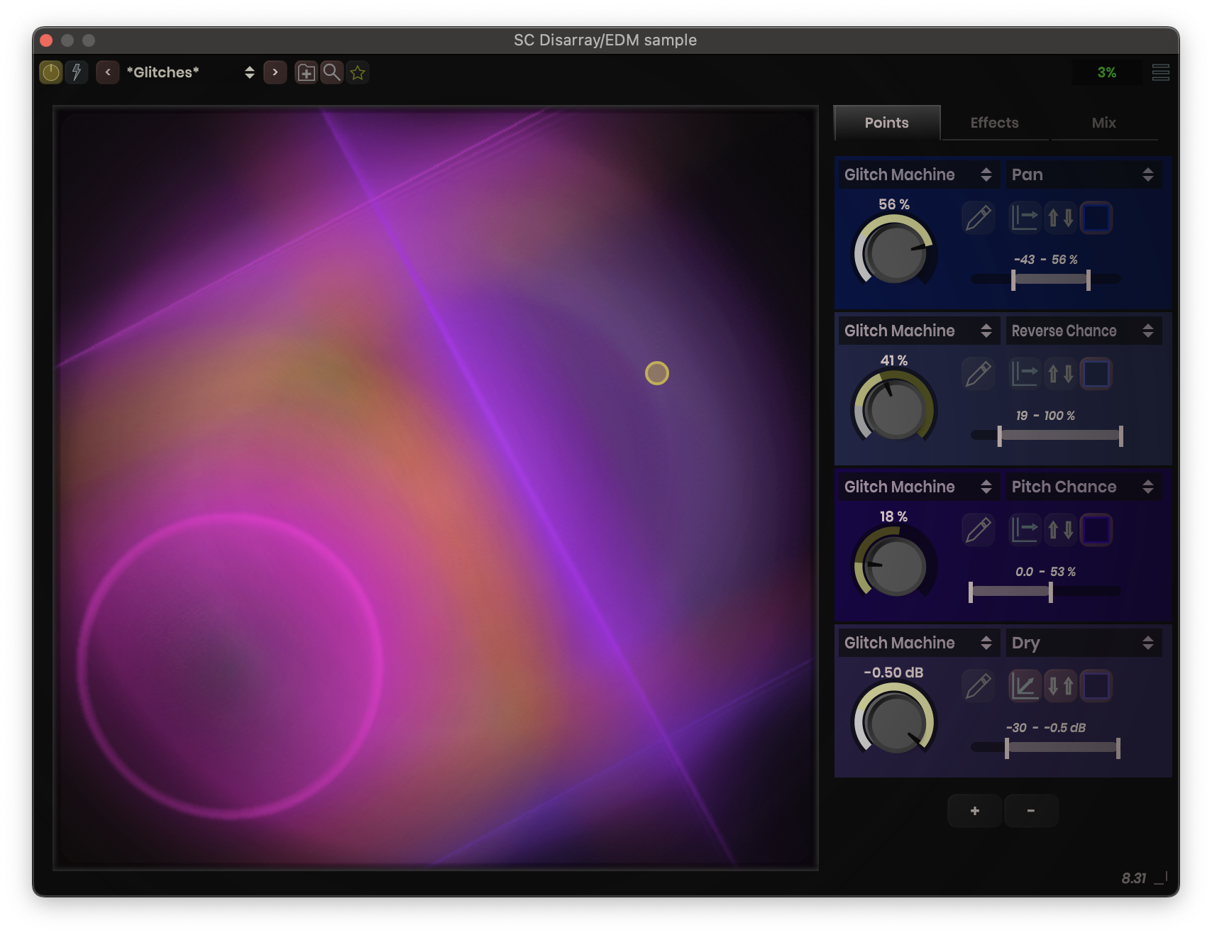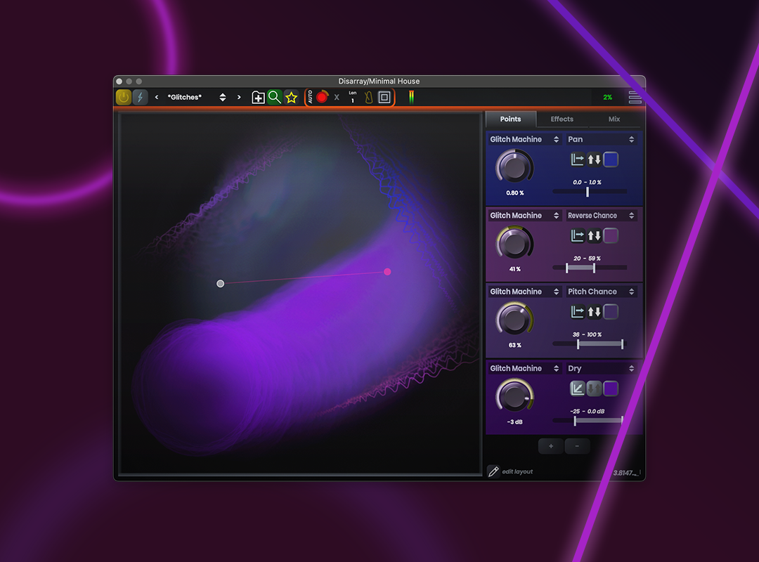 Disarray is directly inspired from the KAOSS pads of a couple decades ago. This simple controller allows you to manipulate multiple effects across and XY plane in startling and amazing ways. Perfect for slow builds, quick drops, effect riding, and soundscapes; this plugin gives you everything you need to truly control you effect chains live.