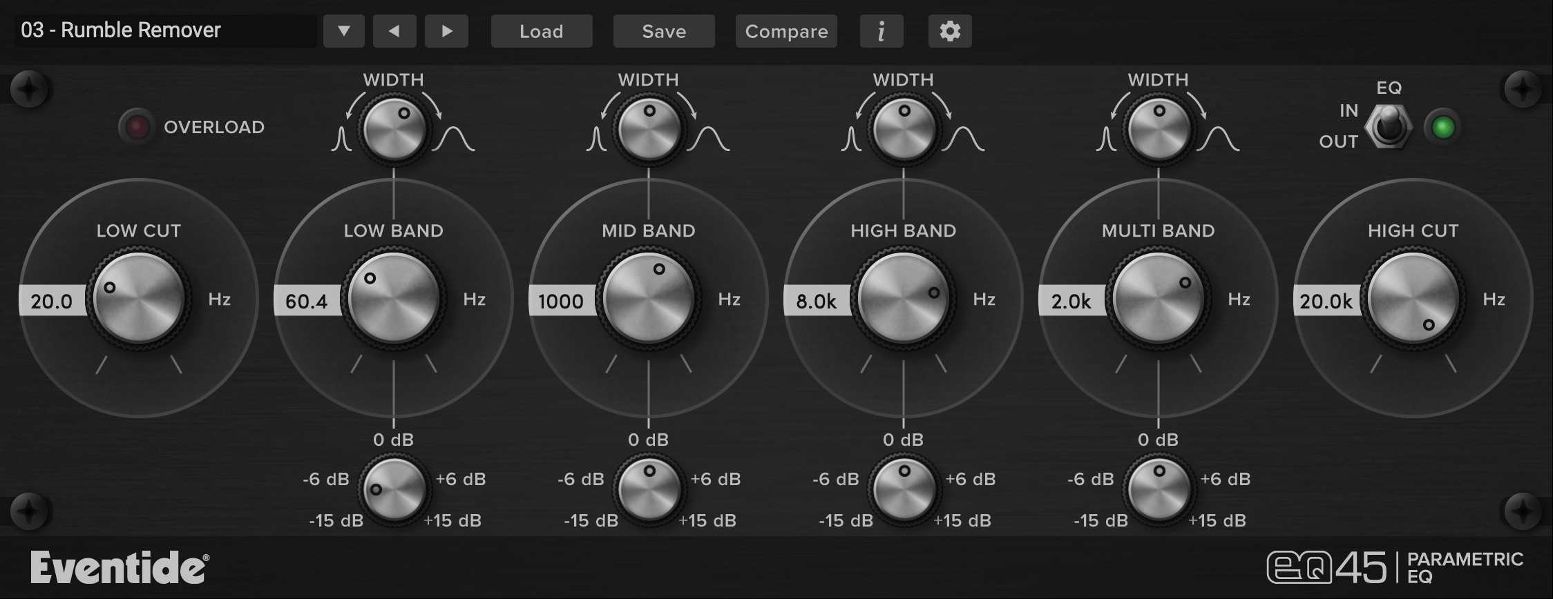 The EQ45 equalizer is an accomplished four-band parametric equalizer and a powerful audio engineering plug-in, featuring high- and low-cut filters that offer an elegant and easy to use environment to perform myriad types of frequency-based signal processing. It boasts a streamlined, easy to use interface, seamless integration with various plugin hosts, and Eventide’s legacy of quality design and accuracy. It is based on the circuit model of the Urei 545 parametric EQ. Features High-cut and low-cut Butterworth filter sections, with attenuations of 12 dB/octave beyond their respective -3 dB points. 24 dB Octave High Pass and Low Pass filters. An overload protection mechanism that responds when a signal’s transient extends above -0.1 dBfs. Capable of subtle or drastic changes without unpleasant artifacts – sounds ‘analog’.