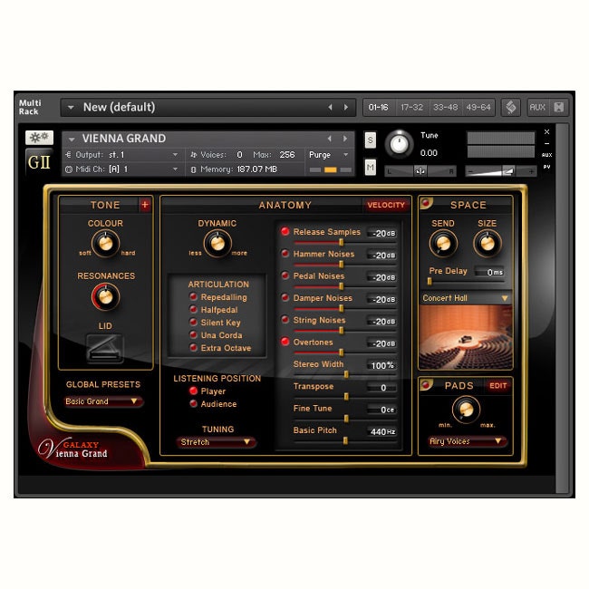 Galaxy II’s Vienna Grand is comprised of sampling a BOESENDORFER IMPERIAL 290 grand piano. Established by Ignaz Bösendorfer in 1828, Bösendorfer are the oldest piano manufacturers still in production have a history of constructing some of the worlds finest instruments. The Model 290 Imperial, a 9’6†grand piano, is famous for its powerful soundboard its extended keyboard; going as far as a bottom C0, making a full eight octave range of 97 keys.