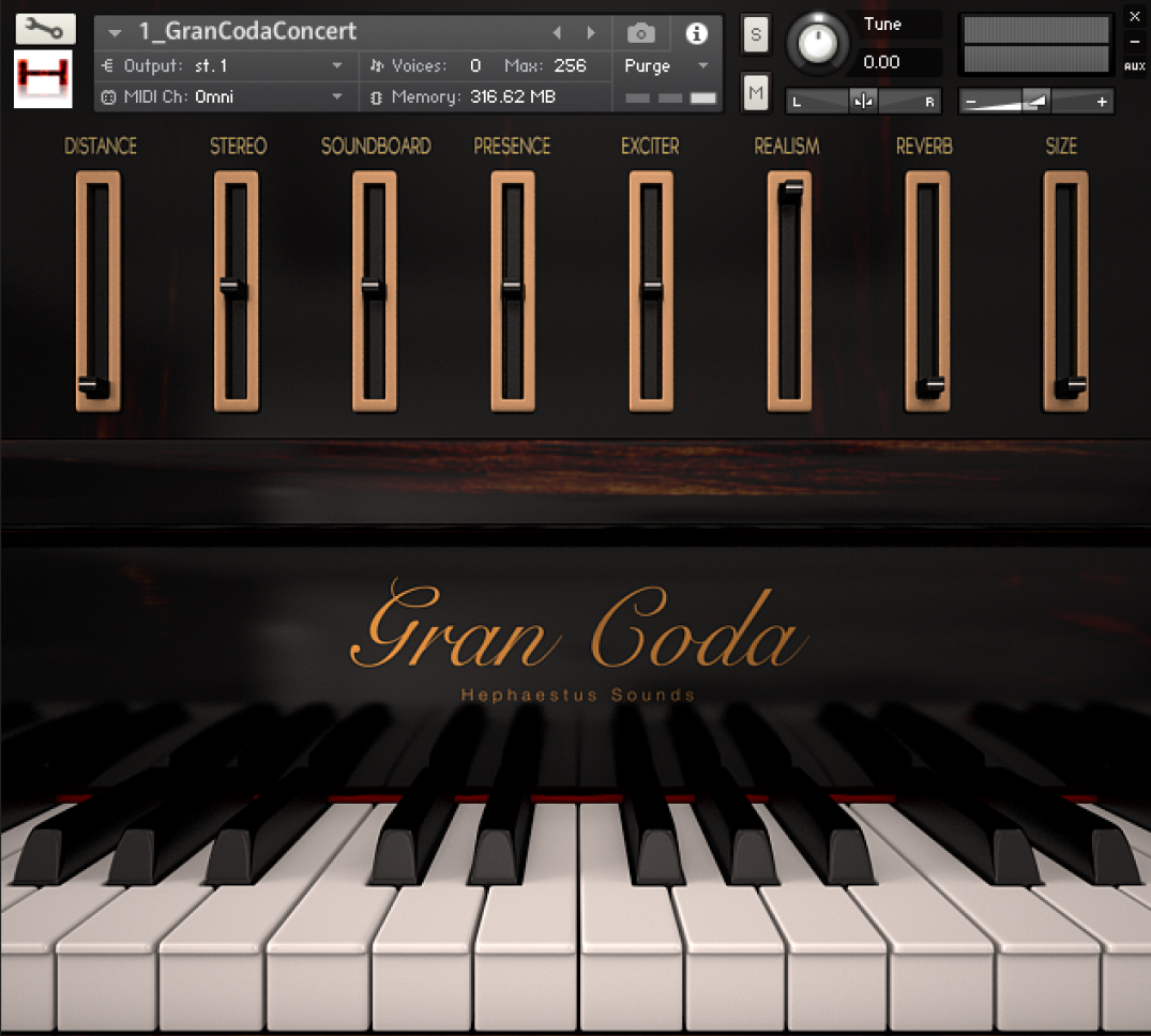GRAN CODA is a new approach in making a virtual grand piano.For the first time a virtual instrument was created in collaboration with the manufacturer: Fazioli Pianoforti (Sacile, Italy).GRAN CODA was recorded in Sacile at the Fazioli Concert Hall and the piano was prepared by Fazioli technicians.The selected model F278 is the resident Grand Piano of the Fazioli Concert Hall and it was inaugurated in 2005 by a great italian pianist: Aldo Ciccolini.Paolo Principi recorded it in 3 different microphone positions: Close (most used in jazz and pop productions), Side (for classic music) and Binaural (to simulate the position of the pianist inside the Fazioli Concert Hall).The virtual instrument was tested and approved by Fazioli technicians inside Fazioli laboratories.