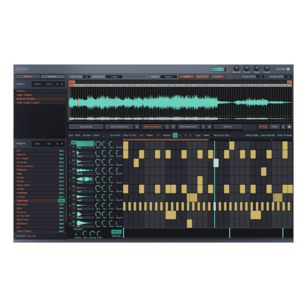 Initial Slice is a loop slicer and beat making plugin. Load audio loops via drag and drop to slice, loop, reverse, pitch shift or even time stretch them. Initial Slice also comes with multiple built in piano rolls so you can create sequences right in the box. On top of this we have an advanced drum sequencer, bass sequencer, playlist editor, 4 effect racks (each with 11 built in effects) and lots of top quality content. Producers from all across the globe came together to built a massive library of over 300 melodic trap, hiphop, drill and rnb loops, drum patterns and beat starters.