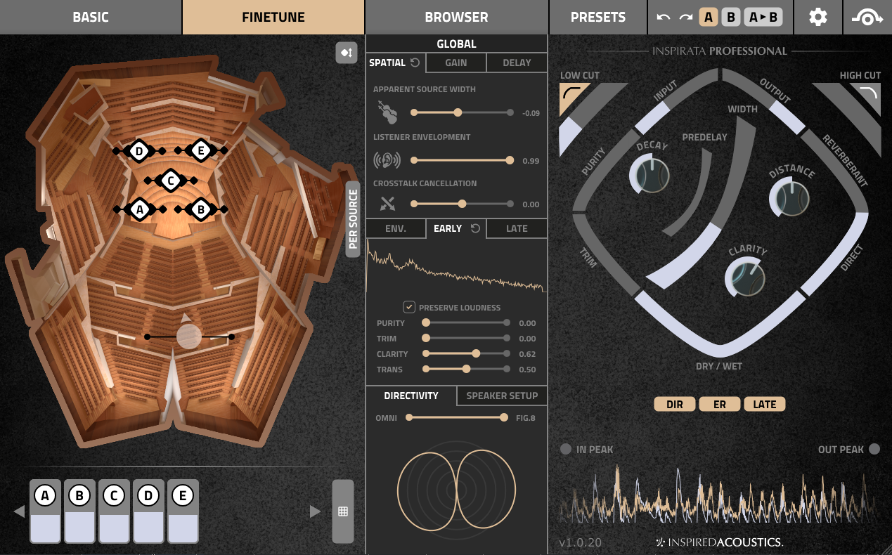 Inspirata Immersive is the flagship reverb workstation from Inspired Acoustics, designed for professionals seeking unparalleled flexibility and realism in spatial audio. It supports surround configurations up to 22.2 channels, making it ideal for complex immersive audio productions. The software features a growing content library with unprecedented spatial resolution, ensuring that even the most demanding applications are met with exceptional quality. With intuitive controls, users can fine-tune parameters and position sound sources and listeners within the selected space, offering a level of control and realism previously unattainable in sampled reverbs.