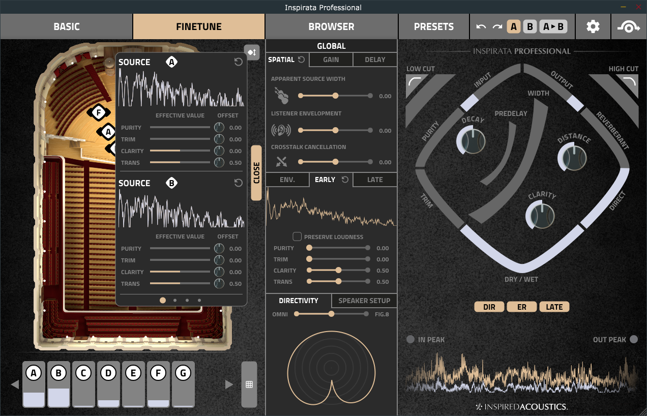 Inspirata Professional is an immersive reverb workstation with an extended feature set, providing flexibility never before seen in sampled reverbs. It supports a wide variety of multichannel output options, from simple surround up to 7.1.2 Dolby Atmos® configurations. The software allows for fine-tuning of parameters and positioning of sound sources and listeners, offering a level of control and realism previously unattainable in sampled reverbs.