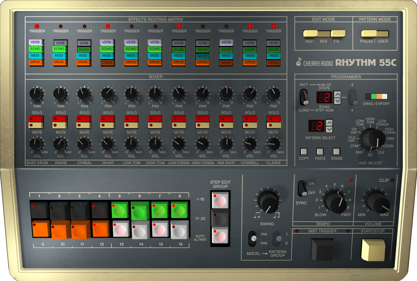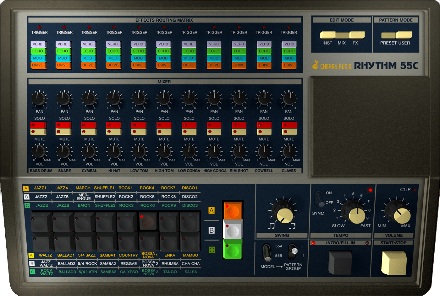 Cherry Audio’s KR-55C is a supercharged, best-of-both-worlds software emulation that combines features from two lesser-known drum machines of the post-punk era: Korg’s “Rhythm 55” KR-55A and KR-55B. KR-55C boasts all the rhythms from both models, for a total of 240 factory patterns, intros, and fills. Additionally, it adds 200 original patterns and kits that cover a wider range of genres. KR-55C’s user interface shifts based on whether the A or B model is selected and includes extra pages that let this beatbox “step out” even further. It features a familiar X0X-style 16-button layout for step-editing and real-time pattern programming, as well as a song mode for chaining up to 99 patterns. Cherry Audio has flawlessly recreated the sounds of the KR-55 using various synthesis techniques, providing users with editable parameters such as tuning and EQ for each instrument. The mixer and effects sections allow for separate processing of each sound, with features including panning, mute/solo, overdrive, flanger/chorus, delay, and reverb. It also includes a bus compressor and limiter for master amplitude control. KR-55C offers DAW-friendly features such as auto-sync, drag-and-drop MIDI export, individual outputs, and complete automation capabilities.The original KR-55 was introduced in 1979 as a replacement for the simpler Mini Pops 35 and Mini Pops 120 drum machines. Although all of these models were preset-only with no option for user-programmed rhythms, the KR-55 represented a significant advancement. In 1982, the updated KR-55B version was released that came with a sleek new design and doubled the internal pattern memory. The patterns and fills were also revised, with very few identical patterns shared between the KR-55A and KR-55B. The KR-55 has been used by many artists, including Depeche Mode, Fad Gadget, Soft Cell, Cabaret Voltaire, Jean-Michel Jarre, and most famously in Joe Jackson’s 1982 hit “Steppin’ Out.”