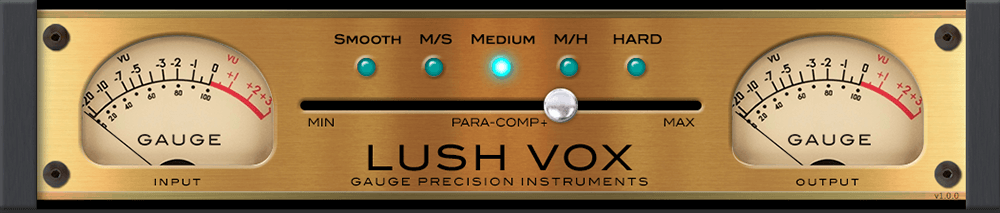 Gauge’s LUSH VOX will improve, expand, and compliment the sound of your vocals and lead lines by adding the tone and character used by professional engineers. “Gauge modeled some sophisticated tools and signal paths when creating LUSH VOX that can yield gorgeous (perhaps miraculous) results. There’s a subtle bit of weight added as you increase the amount slider. It also sounds like there is some saturation being applied in the modeled signal path.” Bill Stunt Recording Magazine “There are different compressors and unique pro vocal chains emulated inside each setting; both analog vintage and modern units are represented. The Hard position does harden up a singer’s timbre as if they sang much louder, whereas Smooth seems very gentle and laid back. I just click through the various five styles to arrive at one that fits the mood, timbre, and vocalist’s style.A great little plugin that simplifies the process of getting a lead vocal sound”. Barry Rudolph Music Connection