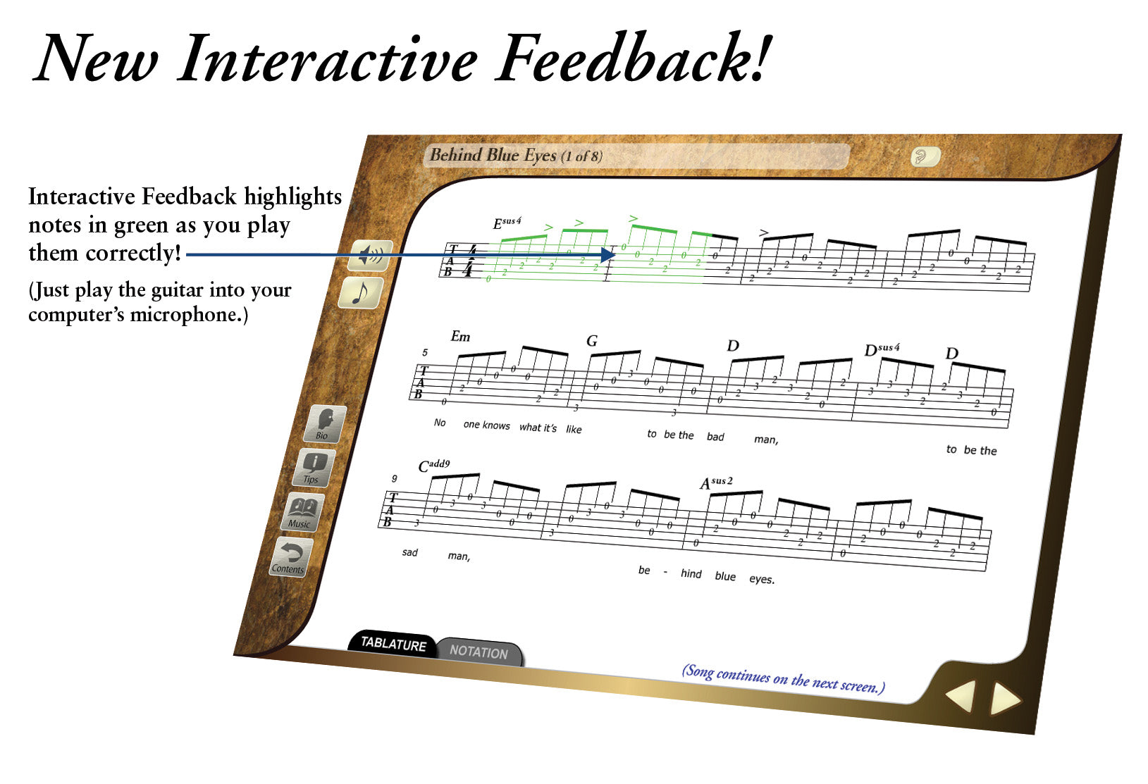 Learn faster and easier with eMedia’s Animated Fretboard, Interactive Feedback, and Performance Evaluation technology! This innovative guitar software listens as you play along with the recording and highlights correctly played notes in melodic lines and solos.