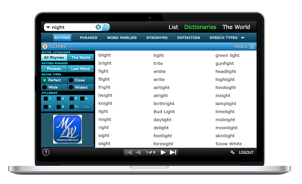 Whether you’re writing a song, poem, novel or screenplay, MasterWriter will help you to express yourself in a unique and more meaningful way.THE BENEFITSORGANIZE YOURSELF PAINLESSLYMasterWriter automatically saves all information and work product related to your project or song. This allows the writer to come back to a finished or unfinished project at any time in the future, and all of the information under that title will be intact.A HELPING HAND WHEN YOU NEED ITMasterWriter will not only help you to express yourself in a unique and interesting manner, it can also jumpstart the creative process by helping you find an interesting idea or direction to write about.TAKE YOUR CREATIVITY TO A NEW LEVELWhy struggle to find the right word using the limited memory of the mind when you can see all the possibilities in an instant? Free your mind to create, let MasterWriter do the rest. This constant exposure to a variety of descriptive words, will enhance and grow your vocabulary and by using MasterWriter, you will become a better writer in the process. To have the reference dictionaries, unique features, and effortless organization all housed in one easy-to-use program is what makes MasterWriter the most powerful and efficient writing tool on the market.RHYMESThe ultimate rhyming dictionary with over 100,000 entries, 36,000 Rhymed-Phrases, and a complete collection of close rhymes.PHRASESThe Phrases dictionary contains over 33,000 phrases, sayings, idioms, cliches and word combinations.WORD FAMILIESA unique reference dictionary that will open up a new world of possibilities for descriptive words and ideas.ALLITERATIONSAlliterate descriptive words with filters that allow you to search by part of speech, word polarity and word intensity.SYNONYMSThe only electronic version of The Synonym Finder, which in our opinion, is the best thesaurus on the market.DEFINITIONSThe American Heritage Dictionary of the English Language provides the definition and pronunciation.THE WORLDA unique collection of over 11,000 icons of American and World Culture that will help put colorful elements and images in your writing.ORGANIZATIONEasily organize all the information related to your projects. Come back in a week or a year and it will be there just as you left it.AUDIOEasily capture and manage your audio recordings. You can also import and export .mp3 audio files.MOBILITYGood to go on all devices, which gives you the flexibilty to capture your inspiration whenever, and wherever you are.Contact Information:Customer Service and Tech Support: 805-892-2656Email: support@masterwriter.com