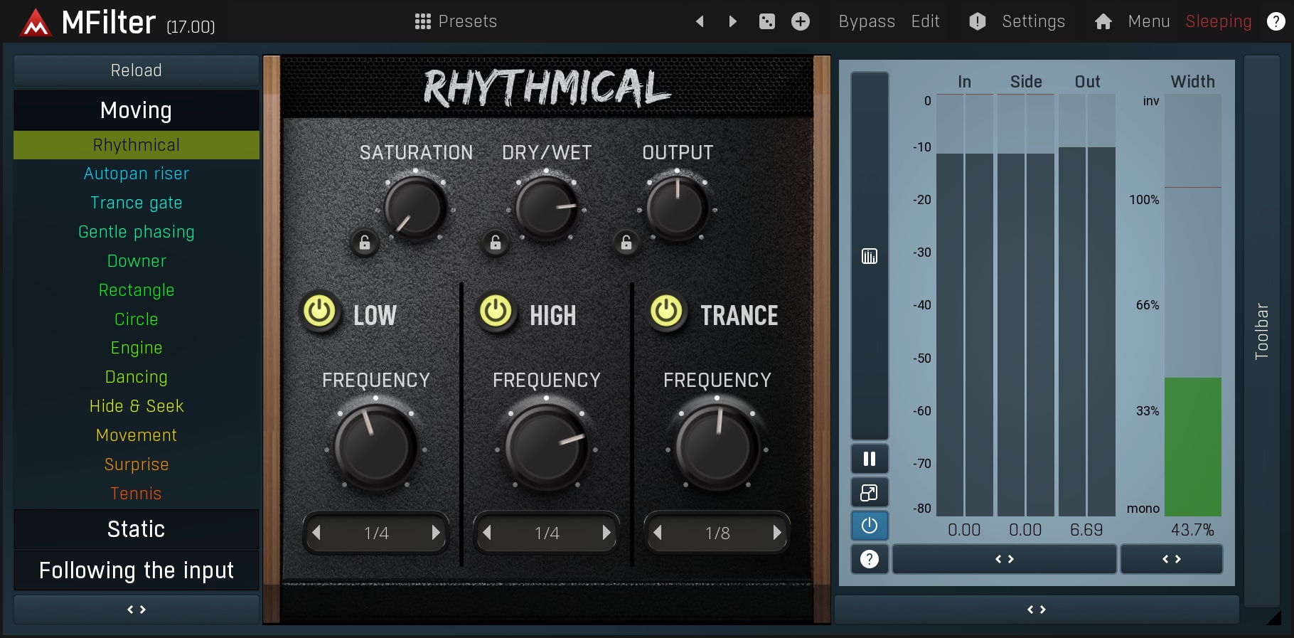 MFilter provides advanced filtering capabilities with a range of filter types and adjustable parameters. Its intuitive interface allows you to shape the frequency spectrum of your audio with precision, from subtle tonal adjustments to sweeping resonant effects. Use it to enhance clarity, remove unwanted frequencies, or add creative movement to your mix. The plugin’s modulation options make it perfect for dynamic and evolving effects. MFilter is an essential tool for detailed and creative audio processing.