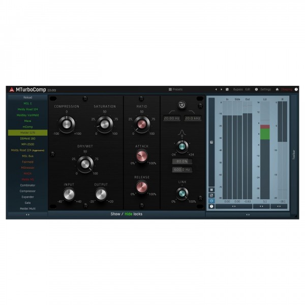 MTurboComp provides a collection of compressor emulations, from vintage hardware models to modern designs. With its flexible architecture, it suits every dynamic processing need, from subtle glue to aggressive pumping.