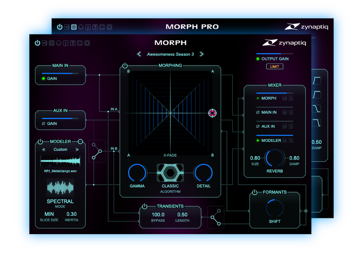 MORPH 3 is a real-time plug-in for audio morphing, the sonic equivalent of one object slowly changing its shape to become a different object – for example, one face becoming another.Super-charged with a selection of up to 11 different morphing algorithms, a style transfer and file playback module, transient bypass options, a stunningly clean formant shifter as well as a lush reverb that seems to extend sounds much like some highly revered vintage hardware boxes, MORPH 3 opens up a whole new universe of sounds to explore.Create seamless morphing transitions, new hybrid sounds that combine aspects of existing ones, physically impossible instruments, the furthest-out creature and robot voices, talkbox-esque effects and other outrageously unique new sounds. Whether you’re a sound designer for film or games looking for that signature sound, or a music producer or remix artist wanting to create new content from existing recordings…look no further, MORPH is for you!SAY “HI” TO MORPH VERSION 3MORPH version 3 is a significant update on version 2, and comes in two variants: MORPH 3 and MORPH 3 PRO.FEATURE HIGHLIGHTSNew features common to MORPH 3 and MORPH 3 PRO: 4 New morphing algorithms: INTERWEAVE V3, IMPRINT SMOOTH, IMPRINT CRYSTAL, ENHARMONIC. The entire suite of V2 algorithms is included, too, of course, for a total of 9 algorithms.New MODELER module that provides particle/granular synthesis based style transfer functionality, as well as straight file playback.Improved FORMANT SHIFTER with +-24 semitones of range; the v2 formant shift algorithm can be activated for the v2 algorithms to get the exact same v2 sound, using a prefs setting.New TRANSIENT BYPASS module that can significantly improve the morphing results. The transients are taken at the A and B inputs to the morphing, and added back in, with their mix controlled by the morphing X/Y control. The transients can be boosted, and may also bypass the formant shifter for increased crispness.Optional internal double precision processing – internal processing can be switched to 64 bit for increased resolution.New soft-knee output limiter.Redesigned, scalable UI with interactive-signal-flow-diagram design, built using vector graphics for sharp visuals when zooming, with up to 200% UI scaling for 4k and larger displays.New Preset Manager application.Previous/Next Preset can now be controlled via MIDI for improved accessibility.Additionally, MORPH 3 PRO adds:2 additional algorithms, FUSION and SONANCE, for a total of 11 algorithms.A multi-zone mapping editor and additional analysis features for advanced control of the MODELER module.An additional DETAIL algorithm for the TRANSIENT BYPASS module.Lowcut/highcut filters for all mixer channels.SPECIFICATIONSMORPH 3 and MORPH 3 PRO support all common sampling rates from 44.1kHz to 192kHz, depending on available CPU resources, and run as 64-bit AAX Native, AU, VST 2.4 and VST 3. The plug-ins support macOS 10.15.x or newer, on Intel & Apple Silicon processors, and Windows 10 or newer. MORPH 3 and MORPH 3 PRO use PACE copy protection, requiring a free ilok.com account, and can be activated to the hard drive of your computer or an iLok 2 or newer USB dongle.FormatsMORPH 3 and MORPH 3 PRO support the 64-bit formats listed below.On macOS:Apple Audio Units (AU)Avid AAX NativeSteinberg VST 2.4Steinberg VST 3On Windows:Avid AAX NativeSteinberg VST 2.4Steinberg VST 3System Requirements WindowsWindows 10 or newerCPU with at least 2 Cores; Intel CPU recommended, i7 or better recommended.Steinberg VST 2.4, VST 3 or Avid AAX compatible 64-bit host software, processing audio as 32 bit float.iLok.com account for machine- or iLok 2/3 based activation (of full as well as demo versions)Internet Connection for Software Activation (though not necessarily on the computer used for audio)System Requirements MacApple Mac computermacOS 10.15.x or newer, 64 bit.Apple Silicon CPU, or Intel CPU with at least 2 Cores (i7 or better recommended).Apple AU (Audio Units), Steinberg VST 2.4, VST 3 or Avid AAX Native compatible Host software, processing audio as 32 bit float.iLok.com account for machine- or iLok 2/3 based activation (of full as well as demo versions)Internet Connection for Software Activation (though not necessarily on the computer used for audio)Channel LayoutsMORPH 3 and MORPH 3 PRO generally come as two binaries, MORPH 3 (PRO) and MORPH 3 (PRO) Dual Mono In.The MORPH 3 (PRO) binary uses the plug-in main input as MAIN IN, and features a side-chain input it uses as AUX IN.The Dual Mono In version uses the left plug-in input as MAIN IN, and the right plug-in input as AUX IN.To accommodate for the particularities of the various plugin formats and DAWs, some plug-in formats include a DualStereoIn (quad-to-stereo) version.Copy ProtectionThis software uses the latest PACE copy protection, which allows you to place your activation on your machine or on an iLok 2* (or newer; not included). You will need a free iLok.com account to use our software, even for the the demos – but you do not necessarily need the iLok 2 dongle, if your machine has internet access (activation of a system without internet connectivity requires an iLok 2 device). All required software is installed along with our plugins, but we generally recommend downloading the latest versions directly from iLok.com.