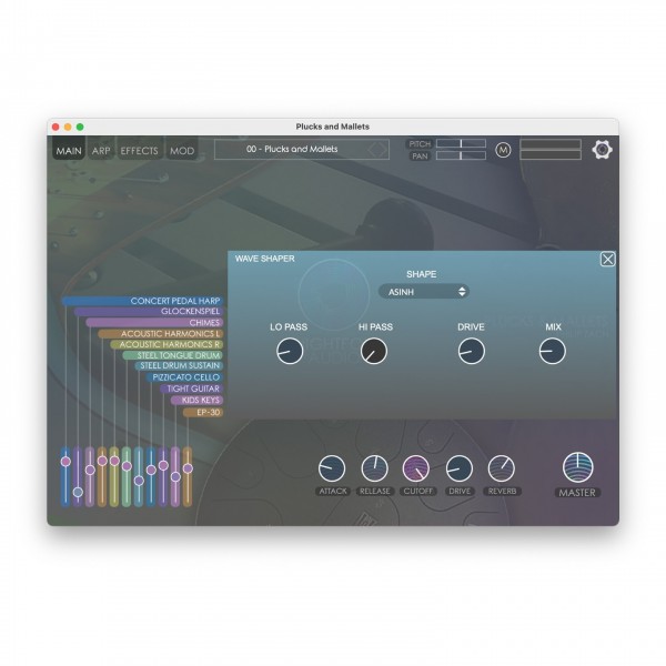 Concert Pedal Harp, Glockenspiel, Chimes, Acoustic Harmonics, Steel Tongue Drum, Cello, Electric Guitar, keys and more. Plucks and Mallets was crafted carefully from 11 instruments so it feels authentic, bold, and daring, with all the sonic quality of real instruments in real spaces, and all the functionality of a synthesizer with full effects.