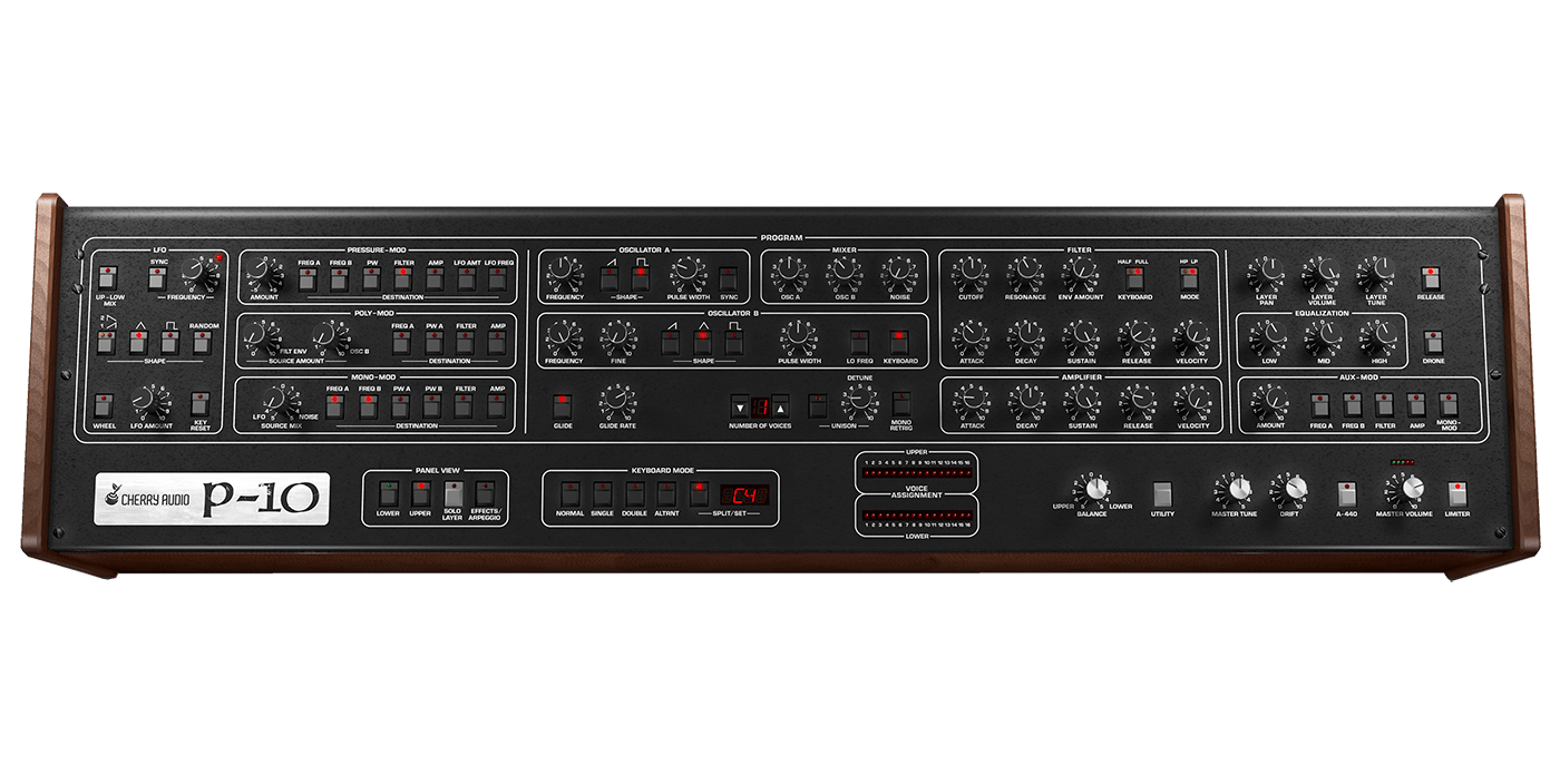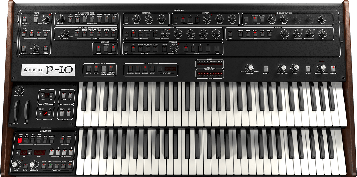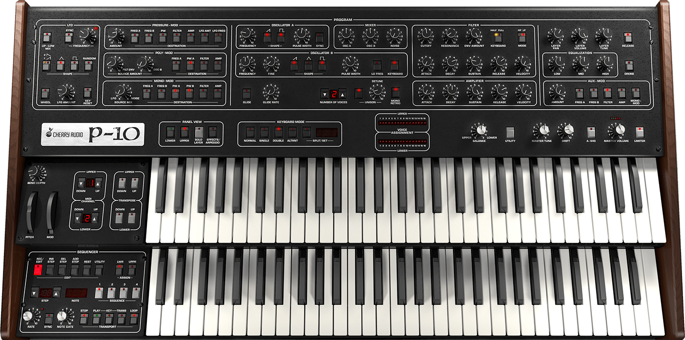 Cherry Audio’s P-10 is based on one of the most desirable flagship analog polysynths ever created. Released by SCI in 1980, the original instrument was essentially two of the revolutionary P5 programmable synths in one behemoth dual-manual case, plus a “poly sequencer” built into the bottom-manual end cheek. It could be configured to play as two independent five-voice synths, a single ten-voice synth, dual-patch layered, or alternating between layers with each keystroke.