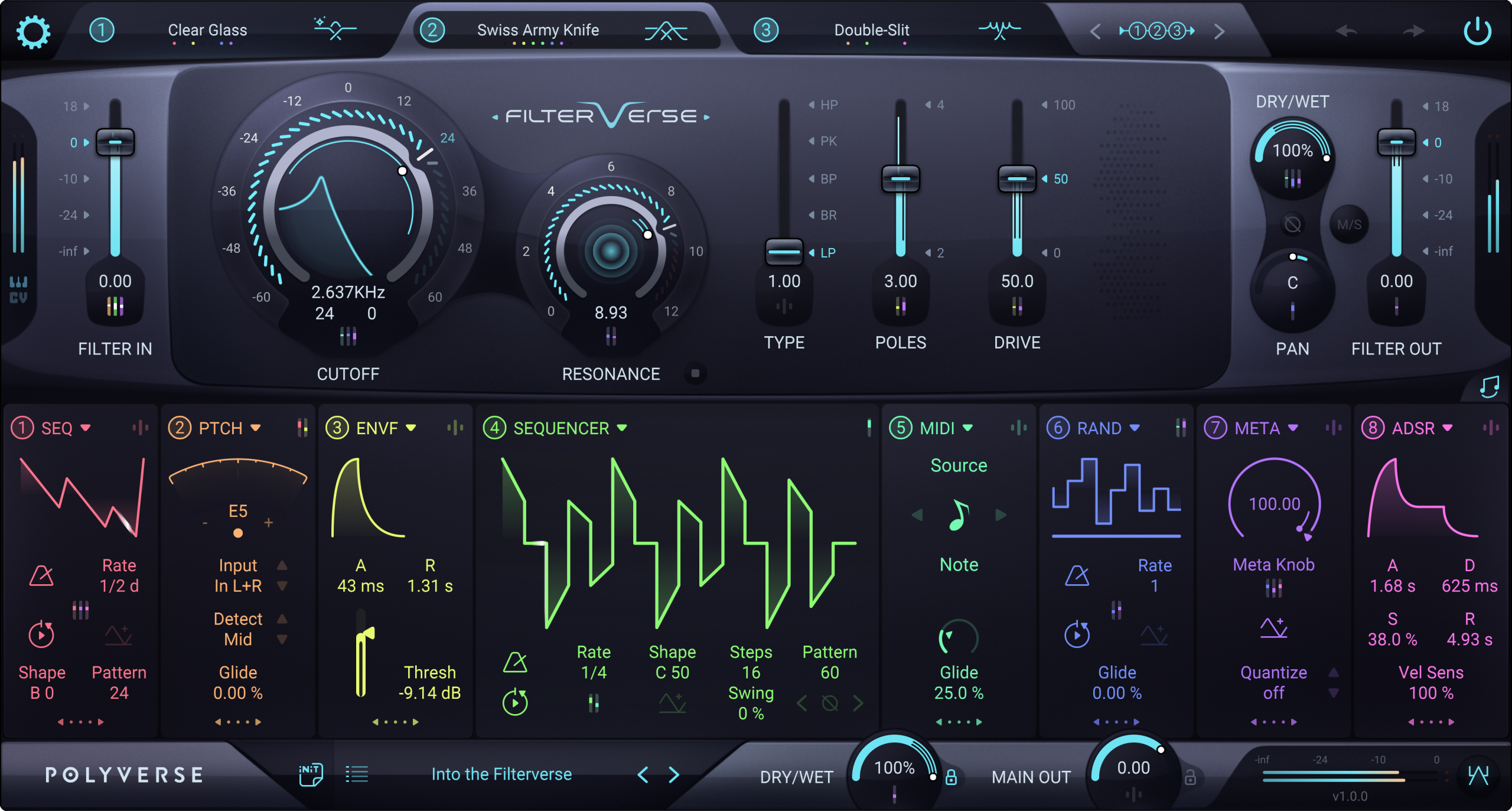 Filterverse is a comprehensive filter plugin offering 30 filter types, ranging from timeless classics to futuristic designs. With over 250 cutting-edge algorithms, it provides a vast array of filtering possibilities. The plugin features three different filters with extensive routing options and eight modulation sources, allowing for complex and dynamic sound shaping. Filterverse is optimized for audio-rate modulation and includes over 500 presets crafted by world-renowned producers, making it a powerful tool for creative sound design.