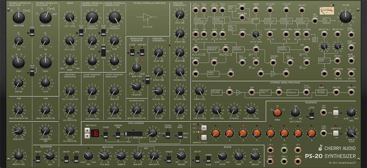 PS-20 Synthesizer Features: Super-accurate modeling of classic MS-style highpass and lowpass filtersUp to 16-voice polyphony with random voice panning availableOver 300 presetsThree-channel, eight-step sequencer with 1/2-step quantizer and tempo syncSingle-key chord memory modeExpanded and simplified full-function patch panelAdvanced, next-generation patch panel cabling system from Voltage ModularExternal Signal Processor section with normalled sidechain inputVirtual instrument and effect plug-in versions includedTempo-syncable modulation generatorUnison detune for massive lead and bass soundsMPE supportFour user-selectable interface color themesDistortion, studio-quality reverb, and mod echo with tempo sync effectsFull MIDI control and DAW automation for all controlsPS-20 is available in AU, VST, VST3, AAX, and standalone formats.A free 30-day demo of PS-20 is available. This demo will play white noise periodically, but is otherwise unlimited.macOS Requirements: macOS 10.9 or above, 64-bit required. M1 processor compatible (via Rosetta 2). Quad-core computer with 8GB of RAM recommended. Windows Requirements: Windows 7 or above, 64-bit required. Quad-core computer with 8GB of RAM recommended.