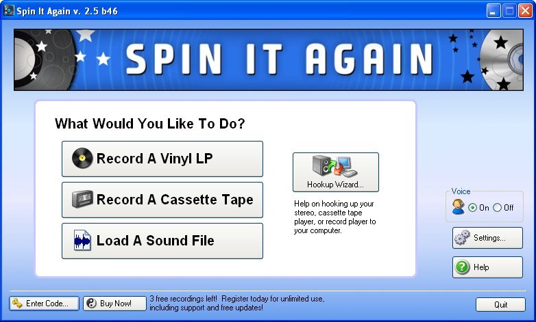 Spin It Aagain is the easiest way to convert Your LPs and Cassettes to CD and MP3. Remember all those `oldies but goodies`? They just don`t make those classic vinyl LPs and cassette tapes on CD. Well, dust off your old 33`s, 45`s & 78`s, because Acoustica`s Spin It Againâ„¢ can easily record any vinyl LP to CD or cassette to MP3. Not only will our software make the whole recording and track dividing process child`s play, but it will also dramatically clean your recordings by getting rid of click and pop record noise, or by removing hiss and hum off old cassettes. You can also record your LP collection and cassettes to your iPod or portable MP3 player! So let your music come to life and Spin-It-Againâ„¢! If you have a Windows computer with a soundcard you`re ready to use our software!