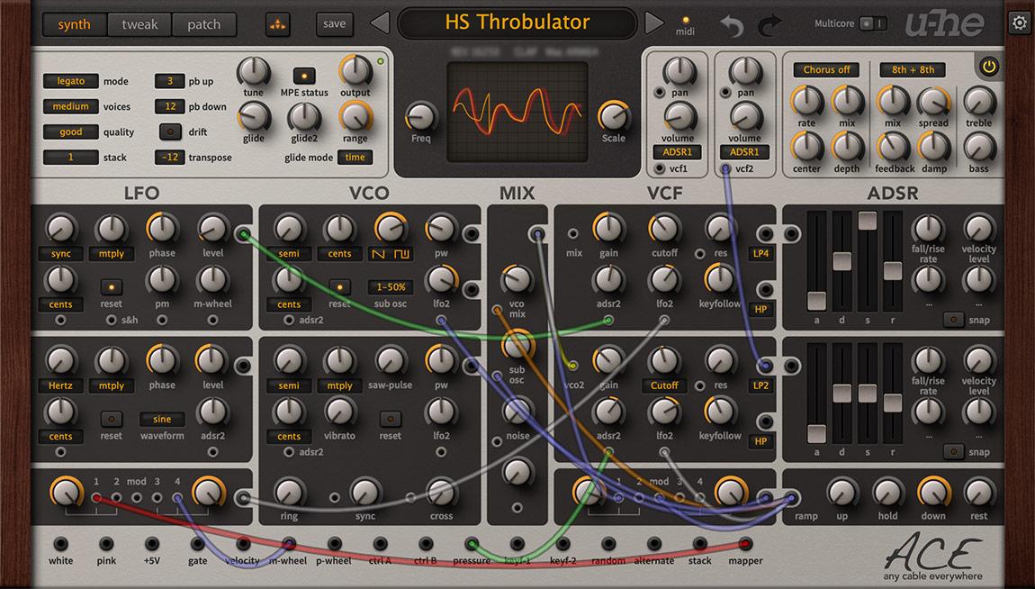 u-He ACE is a versatile virtual analog modular synthesizer, designed for those who enjoy deep sound design and flexibility. It combines a rich, classic analog-style sound with a modular architecture that allows for creative routing of signals and complex patches. ACE features a range of oscillators, filters, and modulation options, making it ideal for creating everything from lush, evolving pads to punchy basslines and intricate leads. Its intuitive interface and expansive modulation capabilities make it a perfect tool for sound designers and producers looking for total control over their sonic creations.