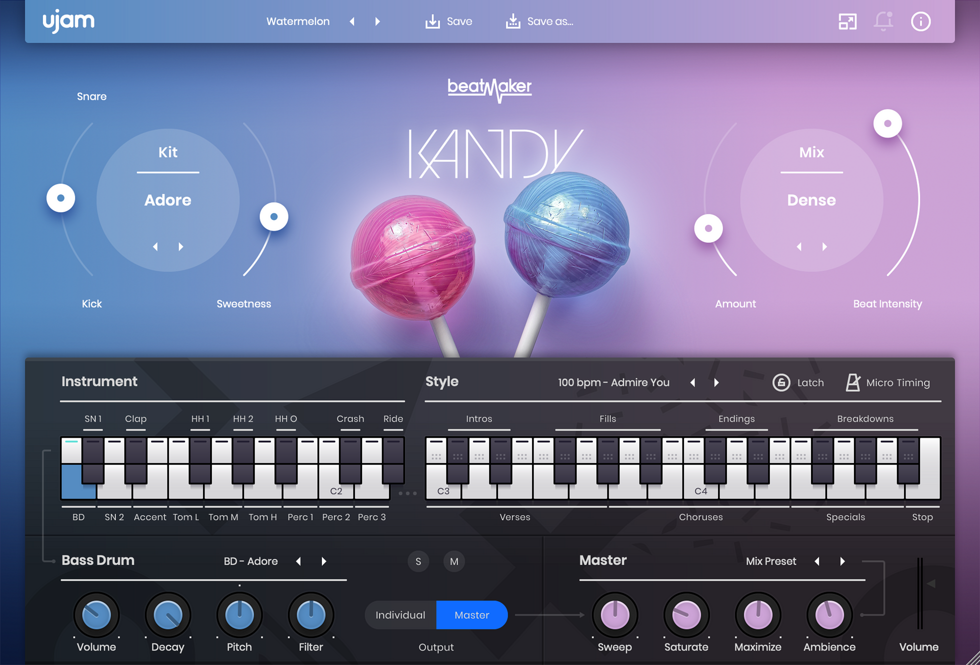 KANDY is a bleeding-edge virtual beatmaker, employing extremely processed samples and state-of-the-art sound design for the top of the billboard charts. Easily create beats for the entire bandwidth of modern A-list pop music!