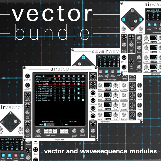 Vector Bundle for Voltage Modular includes 4 exciting new modules, AirWave, Poly AirWave, AirVector, and AirStep. These incredible modules simply have to be heard to be believed. Combining the power of vector synthesis, sample playback, and wave sequencing with raw modular synthesis, these modules deliver a vast new palette of dynamically changing tone colors to Voltage Modular.