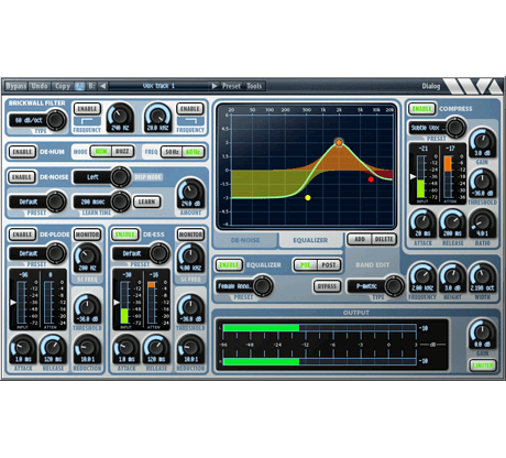 Dialog combines in one plug-in all the processing needed to clean up, adjust, and sweeten recordings of the spoken voice. It is perfect for voice-over, film/tv recordings on location or sound stage, and broadcast.Dialog includes brickwall filters, de-hum and de-buzz processing, broadband noise reduction, de-ploding, de-essing, 10-band equalization, compression, and limiting. Separate presets for each section allow you to get results fast.