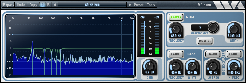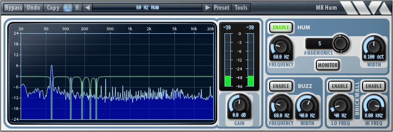 Combining hum removal, buzz removal, brickwall filtering, and spectrum analysis into one easy to use plug-in, MR Hum is the perfect tool to clean up recordings with any sort of hum or nasty buzz.