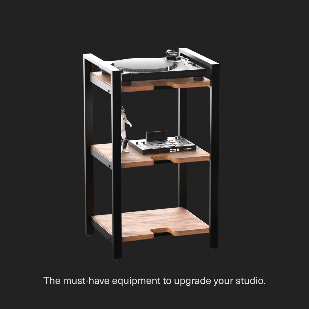 Studio shelf with removable boards for customized setups.