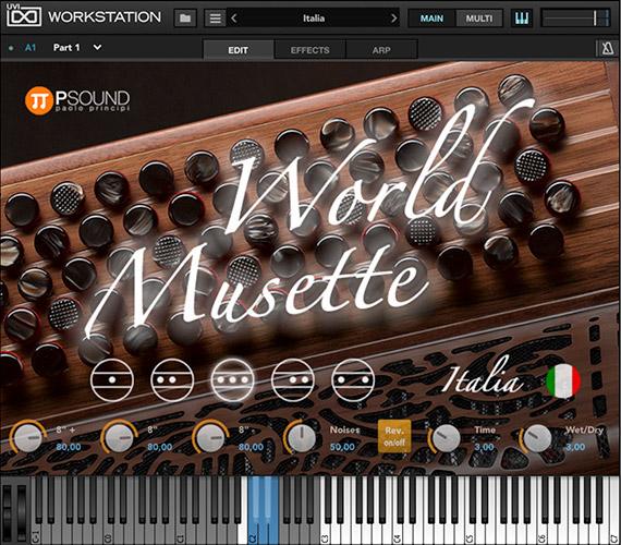 World Musette consists of a collection of “musette” sounds from all over the world: from America to Italy, from France to North Europe more. The Musette Accordion Sound is based on 2 3 voices: the main 8″ voice 1 2 8″ detuned voices. Each kind of Musette has its own detune values, from 4 cents to 23 cents. World Musette implements 7 programs: 6 different kinds of Musette with registers for a total of 20 different Musette sounds 1 Left Hand program for accompaniment.