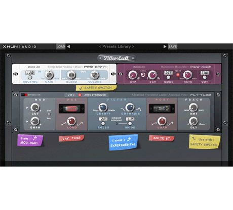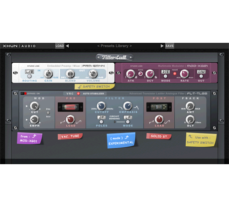 FilterCult is an accurate simulation of the infamous and iconic transistor ladder analogue filter, meticulously preserving its original circuit topology, behaviour and quirks