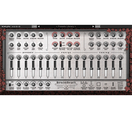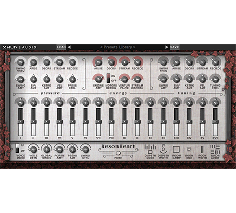 ResonHeart is the physical modeling simulation of a never seen before, experimental, aerophone-based acoustic instrument.Characterized by a complex modal-based architecture, this original machine has expressly been built to mimic the sound of different families of acoustic instruments – like winds, membranes, chromatic percussions, ethnic lutes and whistles, glasses, cymbals and crashes, vocal ensembles and choirs, or even an entire orchestral strings section – as well as to produce very unconventional, organic tones, evolving textures and expressive motion pads.Working on the principles of fluid dynamics and designed to potentially be a real-world replicable machine, every single component inside ResonHeart has been modeled after existing hardware – commercially available devices like air pumps, pneumatic valves and metal resonators. Also the surrounding room acoustics has been carefully modeled, simulating a wide range of spatial environments, from small chambers to big concert halls, to stone-walled cathedrals and beyond.Moreover, ResonHeart features a clean and intuitive interface, making the sound designing process just simple and effective.