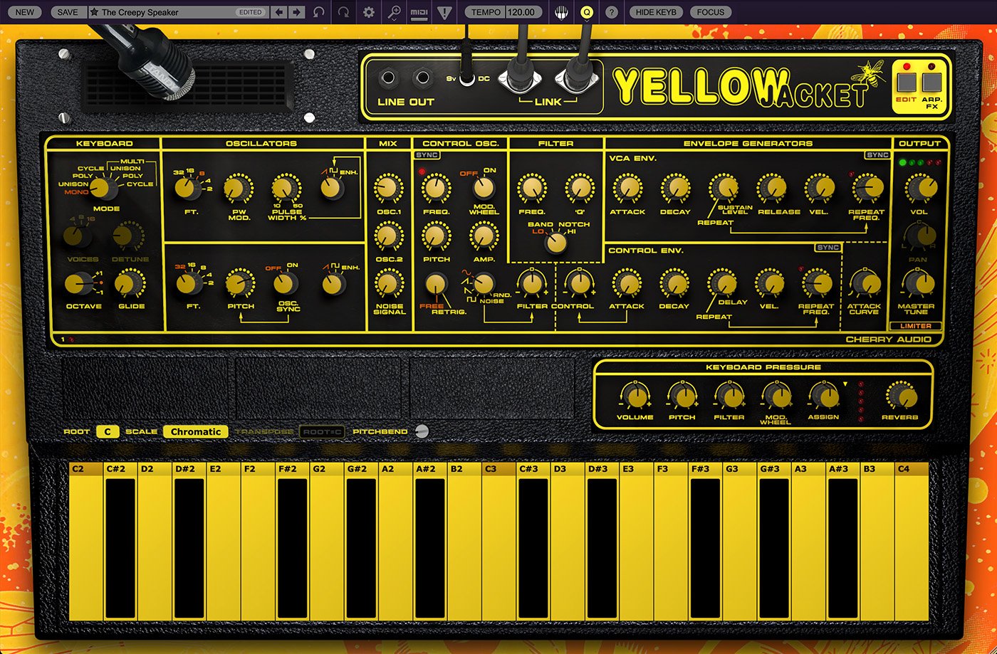 Yellowjacket synthesizer is a stunning value-packed tribute to the venerable Wasp synthesizer, released by the British synth company EDP in 1978. Cherry Audio has reproduced the singular buzzy tone and drone of this legendary monophonic, digital/analog hybrid, from its quirky oscillators to its distinctive filter. Further influenced by the pioneering spirit of its inventors, we’ve added several innovative features to Yellowjacket, reenvisioning what could have been. These include elements of other EDP instruments, unison and 16-voice polyphony, emulation of the Wasp’s integrated speaker, an expanded multimode filter, and a new-to-Cherry advanced arpeggiator with probability and humanise controls. Cherry Audio has replicated the look of the notorious touch-capacitive yellow and black keyboard of the original, enhanced it with diatonic scales and transpose, and extended it with customizable pressure control with support for expressive channel and polyphonic aftertouch. Perhaps the most exciting feature of Yellowjacket is directly inspired by EDP’s innovative pre-MIDI system that allowed multiple synths to be chained together: multi-voice modes that add adjustable “mini synths” that can provide subtle or extreme variation in tone, single-fingered chords and arpeggiated patterns, lush stereo effects, and more.